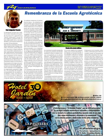 Remenbranza de la Escuela Agrot%u00e9cnicaLa narraci%u00f3n a la que voy a referir es sobre vivencias en la querida Escuela N%u00b0 9 Agrot%u00e9cnica%u201cJuan B. Ambrosetti%u201d, ya que desus or%u00edgenes y primeros a%u00f1os sehan expresado otros, con m%u00e1sdetalles y precisiones hist%u00f3ricasen justo reconocimiento.Hay muchos momentos de an%u00e9cdotas, experiencias, trabajos, rencillas, reuniones, justas deportivas, descanso y esparcimientoque se pueden conmemorar, yque seguramente forman partede reminiscencias personalespara compartir con la comunidad de Gualeguay, que en eltiempo justo comprendi%u00f3 la importancia de la educaci%u00f3n, fomentando desde los docentes yfuncionarios de la %u00e9poca la necesidad de la formaci%u00f3n agrot%u00e9cnica hace ya cinco d%u00e9cadas atr%u00e1s.Todo comienza con la llegada delos ingresantes, peque%u00f1os, fr%u00e1giles, con miradas de asombro,acompa%u00f1ados de sus padres, oun abuelo, o tutor, con unos pocos %u00fatiles escolares algunos yotros, los internos, con los bolsosy ropa de cama, los colchones ala ma%u00f1ana temprano el primerd%u00eda de clases%u2026ya est%u00e1bamos elpersonal listo para esperarlos enel patio a medida que llegabandesde kil%u00f3metros recorridos apartir de los m%u00e1s remotos lugares de la campa%u00f1a o de las distintas zonas de la Ciudad. El colectivo escolar hac%u00eda su presenciamagn%u00edfica, avanzando animoso yesforzado, aunque deshilachadasu pintura por el fragor del servicio en a%u00f1os a la ense%u00f1anza.Comenzaba la ceremonia del izado de la bandera y las palabrasde bienvenida del Director, losalumnos mayores ya sab%u00edan aqu%u00e9 curso acomodarse, si hab%u00edapromocionado o no, y mirabande reojo a los biso%u00f1os ya fij%u00e1ndose en alguna peculiaridad personal para desarrollar la imaginaci%u00f3n con alg%u00fan sobrenombreocurrente que luego acompa%u00f1ar%u00e1 para toda la vida escolar y social del infortunado%u2026pero a lalarga aceptado como un t%u00edtulo denobleza y pertenencia a la querida escuelita. En el recuerdo unalumno que hab%u00edan apodado %u201cgarrafa%u201d, porque viv%u00eda pegado a lacocina%u2026Los momentos m%u00e1s tensos ser%u00edan con los alumnos que se alojaban por primera vez en el Servicio de Internado, acompa%u00f1adosde sus padres, estos observandoy averiguando toda condici%u00f3n alPreceptor Ayudante de Internado, mientras la madre preparabala cama por primera vez dondeanidar%u00eda su hijo en solitario aunque acompa%u00f1ado por los dem%u00e1sinternos%u2026y ah%u00ed aparec%u00eda el mejoralumno compa%u00f1ero del Internado, entre los m%u00e1s antiguos, designado por sus pares como l%u00edder,que alentaba con palabras de optimismo a los ingresantes. Ya lajornada estaba en marcha y lospadres con besos y abrazos desped%u00edan a sus hijos, otros un apret%u00f3n de mano de alg%u00fan abuelo opadrino que se compromet%u00eda enese momento de encargo del peque%u00f1o gur%u00ed.Y as%u00ed pasaba la primera semana,conoci%u00e9ndose unos a otros, endonde las diferencias se fund%u00edanen un solo esp%u00edritu de compa%u00f1erismo con el correr del tiempo, ylos d%u00e9biles se hac%u00edan fuertes, ylos rebeldes o d%u00edscolos se volv%u00edanserviciales y respetuosos. Desdetemprano se compart%u00edan los mates, las golosinas del kiosco, eldesayuno (mate cocido o chocolatada) y la galleta. Horas de clases en las aulas y en el campo, enlas secciones did%u00e1cticas productivas, que era un mundo distintopara los alumnos, de contactocon la naturaleza, los animales,las plantas y el trabajo de campo,acompa%u00f1ados por el personalprofesional y de maestranza quecari%u00f1osamente siempre cobijaban a m%u00e1s de uno como favoritopara determinadas tareas.El almuerzo en el comedor, todosen fila y ordenados para retirar lacomida y pasar un momento dedistracci%u00f3n cont%u00e1ndose las experiencias del d%u00eda y algunos comiendo r%u00e1pido para repetir hastala %u00faltima cucharada de la olla. Depostre se serv%u00eda queso y dulce,compota de manzana y otrasconfituras que hablaban bien delec%u00f3nomo de turno%u2026pero cuandoeste desaparec%u00eda ya se present%u00edaque el plato venia dif%u00edcil%u2026Despu%u00e9s del comedor se habilitaba el Internado para cambiarsela indumentaria e higienizarsepara las clases de la tarde, laspr%u00e1cticas de huerta, vivero, cunicultura, avicultura, producci%u00f3nde bovinos, porcinocultura, apiProf. Alejandro VaccariFrente del actual edificio-