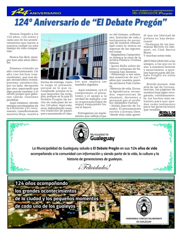 124%u00ba Aniversario de %u201cEl Debate Preg%u00f3n%u201dHemos llegado a los124 a%u00f1os, con todos ycada uno de los acontecimientos que hacen anuestra ciudad en estetiempo de vida compartido.Nunca fue f%u00e1cil, siempre han sido a%u00f1os dif%u00edciles.Estamos viviendo una%u00f1o convulsionado. Una%u00f1o con hechos trascendentes, que nos dejan sensaciones contrapuestas; satisfacci%u00f3n,por un lado, decepci%u00f3npor otro, esperando quealgo pueda cambiar y elrecelo propio que generan tantas i lus ionesperdidas.Aqu%u00ed estamos, siendotestigos privilegiados dela evoluci%u00f3n y el crecimiento, transformandonuestra Hoja, nuestraforma de entrega, comolo ex ige e l presente,porque es lo que corresponde, porque es loque imponen los tiempos, porque es lo que ElDebate Preg%u00f3n ha hecho en cada paso de estos 124 a%u00f1os. Aqu%u00ed estamos, defendiendo nuestra tradici%u00f3n de papel,pero asumiendo el camb io que imp l ica sertambi%u00e9n digitales.Aqu%u00ed estamos, con elcompromiso, el plural ismo y e l apego a laverdad de siempre, conla responsabilidad deseguir empujando hacia el futuro.Entregamos un suplemento que refleja el paso del tiempo, reflexiones, historias de vida ytestimonios de personas de nuestra comunidad como lo vemos enalgunas de las siguientes notas:%u2022 Magdalena Campostrini destaca la obra de laArtista Pl%u00e1stica CristinaG%u00f3mez.%u2022 Javier Bello sobre detalles y reliquias de Parroquia San Antonio.%u2022 Homenaje a sus amadas maestras de sus 7a%u00f1os por nuestra querida escritora Tuki Carboni.%u2022Historia de vida. Escuela Agrot%u00e9cnica, recuerdos, exper ienc ias dea lumnos, docentes ypersonal por el profesor Alejandro Vaccari.%u2022 Zelika Alarc%u00f3n de Tama%u00f1o. El pensamientoescrito y prensa libre,%u201cdesde muy ni%u00f1a aprend%u00ed que sin libertad deprensa no hay democracia%u201d.%u2022 Destaque de las hermanas Belloto en b%u00e1squet, en C lub Barr ioNorte. Y muchas notas m%u00e1s.%u00a1MUCHAS GRACIAS a losamigos, a los que no loson, a nuestros lectoresy anunciantes, a quienes fueron parte del Debate Preg%u00f3n en estos124 a%u00f1os!Brindo porque, m%u00e1sall%u00e1 de las de circunstancias, las p%u00e1ginas denuestra hoja sigan recogiendo, cotidianamente, los hechos m%u00e1s salientes para que queden como test imon iopara las generacionesque vendr%u00e1n.SILVIA L. DELAGRENADEHavcesiEteqm%u00f1pcacocmpcamaddpcqqla